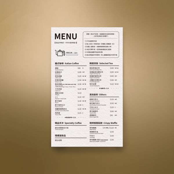 極簡設計的咖啡廳菜單以簡潔清晰的呈現方式,強化品牌的設計感與現代感,適合定位為高端且追求簡約的咖啡廳。極簡的排版讓顧客能輕鬆找到所需資訊,提升用餐體驗。