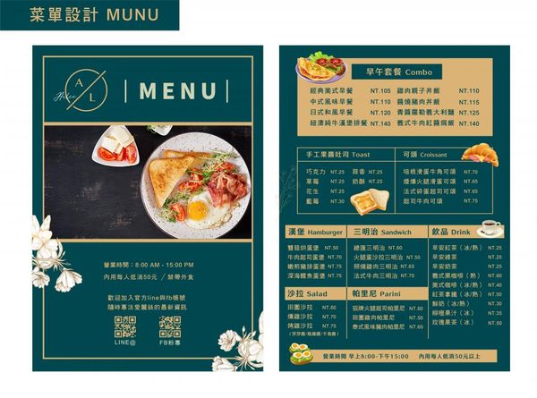 藍綠色系的菜單以自然色系帶出清新感,且能讓顧客感受到平靜與舒適,並增強顧客對品牌的清新形象記憶,適合追求自然風的咖啡廳。