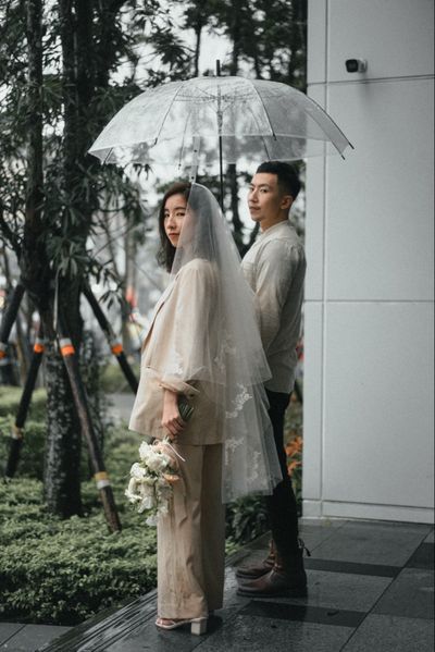 即使在雨天,輕婚紗風格依然能夠帶來與眾不同的浪漫感覺。雨滴打在透明雨傘上,新人相互依偎的樣子,讓整個畫面多了一份溫馨的感覺。雨天拍攝的獨特之處在於,它能夠營造出一種夢幻而詩意的氛圍,讓人難以忘懷。