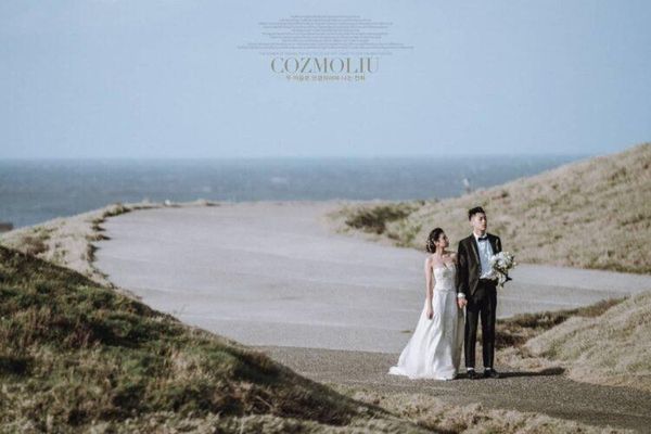 ▲照片展示了一對新人手牽手在海邊小徑上漫步的情景,背景是寬闊的藍色海洋,充滿了悠閒與自由的氛圍,讓人感受到大自然中的無拘無束。