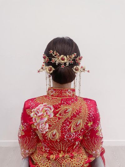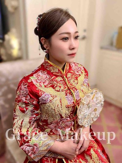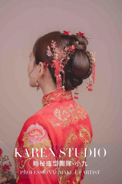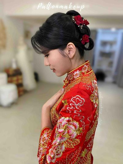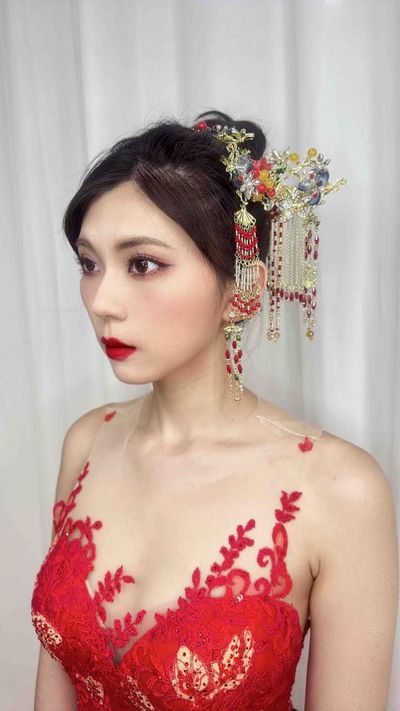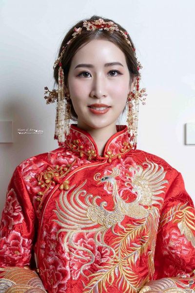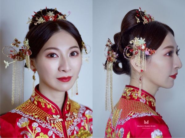 中式新娘造型有很多種類,新娘可以根據自己的需求選擇適合的風格。不論是傳統的盤髮,還是加入現代元素的創新髮型,這些髮型都能夠展現出新娘的優雅氣質。傳統的中式盤髮通常整齊大方,象徵著端莊與典雅,例如:以傳統盤髮風格搭配金色的龍鳳褂刺繡和新娘飾品,讓新娘看起來非常高貴。這樣的髮型不僅在視覺上增加了新娘的氣場,也在象徵意義上強調了幸福和吉祥。而現代的中式髮型則更注重浪漫感,不僅保留了傳統元素,還增添了自然浪漫的氣息,讓整個造型更具個性和時代感。
