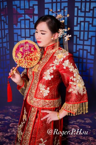 髮飾是中式新娘髮型中不可缺少的部分,精緻的髮飾可以讓整體造型更加華麗和獨特。常見的中式髮飾有金色髮簪、珠花和流蘇...等,這些髮飾不僅可以增加美感,還有特別的象徵意義。例如:金色髮簪象徵富貴與吉祥,而珠花則象徵美麗與高貴,流蘇則代表長長久久的祝福。選擇髮飾時,要根據髮型的風格進行搭配,這樣才能讓整體造型更加和諧統一。下面照片中的新娘用精緻的金色髮簪和流蘇裝飾了她的傳統盤髮,使整體造型顯得更加優雅華麗,整個造型充滿了富貴和典雅的氣息,黑髮新娘則手持團扇,搭配細緻的髮飾,讓傳統的中式風格更加完整,增添了一種古典美。