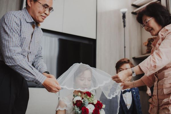 ▲照片中可以看出長輩們為新娘覆紗時的神情,這是一個充滿愛與祝福的瞬間,值得用心捕捉並呈現出這份深厚情感。這樣的畫面不僅僅是照片,還是一份能讓人重溫當時感動的記憶。