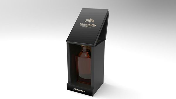 威士忌禮盒採用簡約設計,除了燙金的品牌名,盒身沒有一絲多餘的設計,材質則選擇厚紙板搭配特殊的結構設計,以簡約的方式展現高價禮盒的精緻與典雅。