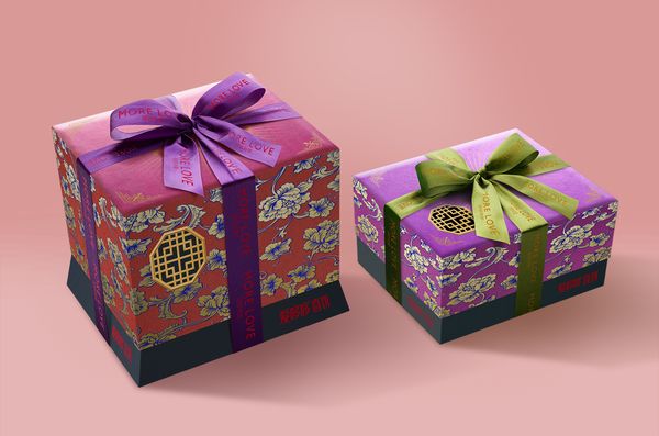 中式的喜餅禮盒設計採用傳統的牡丹花圖樣,以及中國富貴的紅、紫色搭配緞帶,並於包裝盒設計中式花窗,具有宮廷皇族的奢華感。