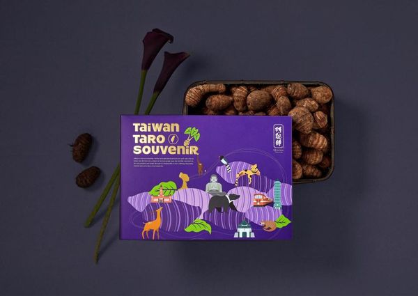 芋頭禮盒設計完美結合台灣的農業、飲食文化與創意,以芋頭所代表的紫色搭配可愛的台灣特色插畫,成為地方伴手禮產品的包裝設計佳作。