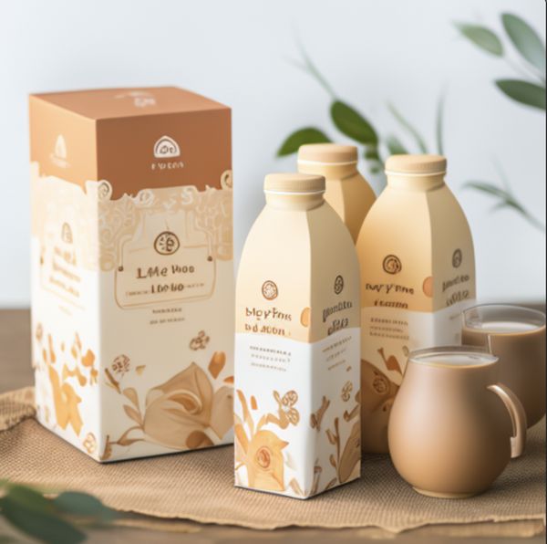 牛奶飲品禮盒以常見的瓶罐作為包裝結構,但在瓶身曲線與材質、圖樣設計上別出心裁,展示功能性與美觀設計的完美結合。