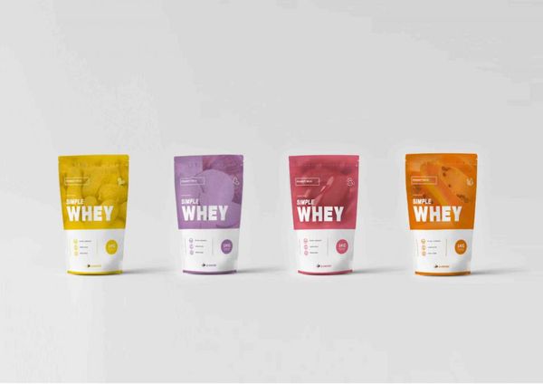 乳清蛋白的包裝設計以現代簡約風格抓住消費者的注意力,且搭配不同口味的蛋白,選用了不同的亮眼色彩,一字排開的陳列能在超市架上迅速吸引消費者目光。