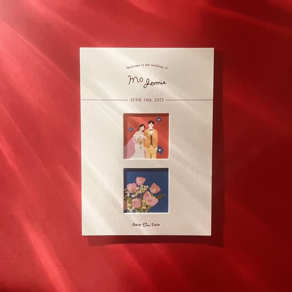 插圖風格的婚禮請柬透過獨特的似顏繪設計,增添婚禮的趣味性與故事感,另外還搭配刻有新人英文名的木製禮物,每一張請柬都充滿個性化的細節,讓受邀者感受到新人對婚禮的用心和獨特魅力。