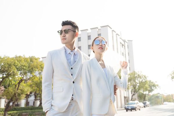 同色系裝搭配墨鏡是都市風便服婚紗的絕佳選擇。新郎與新娘站在街道中,俐落的穿搭與都市建築相得益彰,這樣的搭配不僅展現時尚品味,還為照片注入現代感,特別適合熱愛城市生活的新人。
