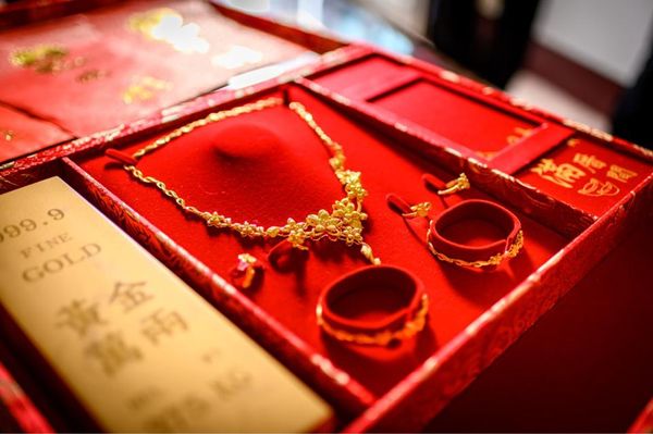 拍攝金飾禮盒的細節,展現出訂婚儀式中的傳統與祝福,金飾的展示不僅代表著富貴與繁榮,也寄託了家族對新人幸福生活的美好期盼,每一件金飾都象徵著對新人的祝福,代表著未來生活的富足與順遂。