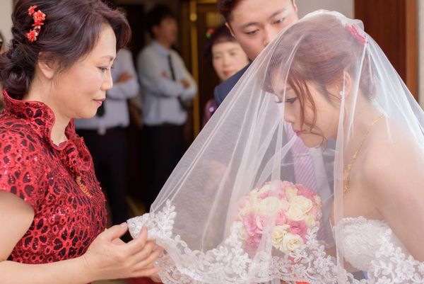 送別是文定儀式中最感人至深的環節之一,充滿了對新娘的祝福與不捨。拍攝新娘在家人幫助下整理頭紗的場景,下圖照片呈現母親對女兒的不捨與祝福,讓觀眾感受到家庭的溫馨與深情,母親為新娘整理頭紗的那一刻,是情感最濃烈的瞬間,充滿了對女兒的愛與祝福。母親眼中的不捨和對女兒的關懷,在這一刻無比動人,這是母愛最直接的表達,也是家庭之愛的深刻體現。