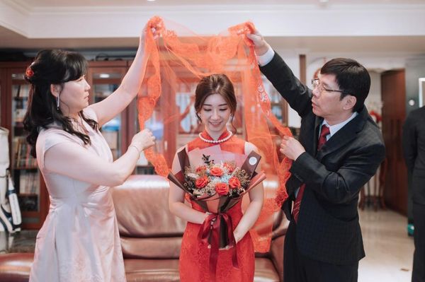 父母為準新娘披上婚紗蓋頭的動作,不僅代表著訂婚流程的開始,也象徵著女方家父母對孩子的深厚祝福,這一刻,父母臉上的表情、手中的動作,都充滿了對女兒的呵護與期望。