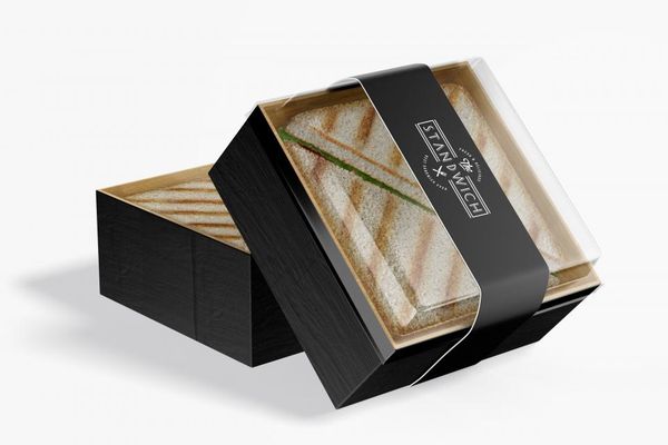 三明治外帶盒以木板紋路的紙盒搭配透明盒蓋,並在包裝上加展示品牌名稱與Logo的紙條,以簡約且高質感的包裝視覺,展示便攜性與高級感的完美結合,成為外帶食品包裝的典範。