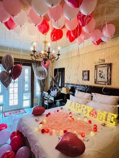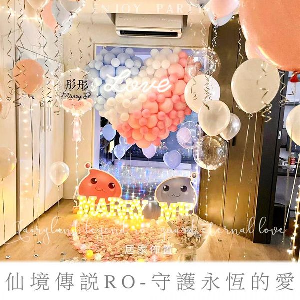 氣球是求婚佈置中最具象徵浪漫的元素之一,不僅能瞬間提升求婚的氛圍,也能讓空間充滿夢幻的氣息。造型氣球可以選擇多種顏色與款式,無論是經典的紅色、粉色,還是帶有閃亮效果的金色,都能讓現場更加華麗,您也可以選擇愛心造型汽球、求婚戒指造型氣球、透明氣球、空飄氣球...等,或是在氣球上訂製字樣,這樣的個性化佈置能讓求婚更加感人,讓另一半感受到您的特別用心。