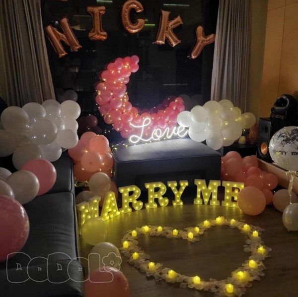 想讓求婚佈置更加個性化?使用名字或字母氣球是一個非常好的方法,用您們的名字首字母或「Marry Me」等字樣來裝飾,讓求婚場景顯得獨一無二。這樣的設計能讓對方感受到您的心意與創意,感覺到這是專屬於另一半的驚喜,您還可以把另一半的名字用氣球拼出來,這樣的設計不僅能讓場景更加特別,也讓另一半感受到這一切都是為另一半量身定制的,充滿愛的驚喜。