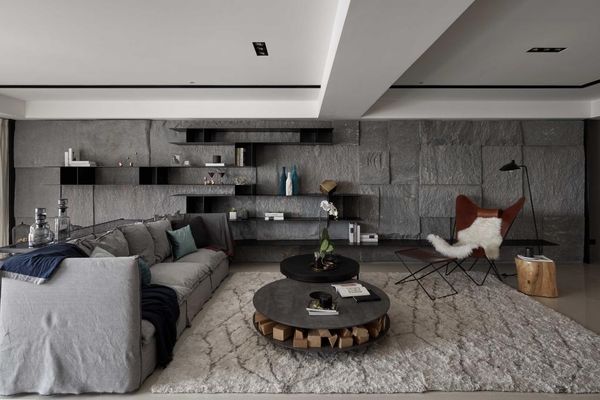 粗獷的岩板背景牆與層板的結合,既能保留原始自然的質感,又能增添現代感的收納功能。層板的設計在這樣的空間中,帶來了視覺的多樣性與層次感,使客廳成為一個富有個性和品味的生活空間。此外透過不規則的層板擺放方式,讓背景牆的設計更顯大氣。