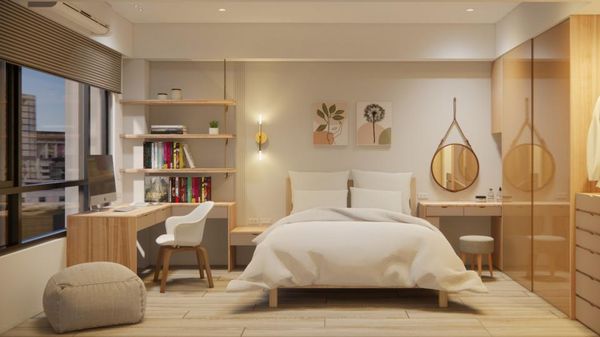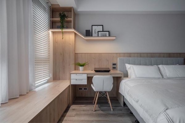 如果家中臥室兼作書房使用,透過層板增加牆面與畸零空間的收納機能,擺放書籍、文具等,保持工作區域的整潔,也能放置一些裝飾品來增添氛圍,既能保持空間的開放性,也能增加收納功能,使得臥室與書房之間的界線變得更為模糊而有趣。