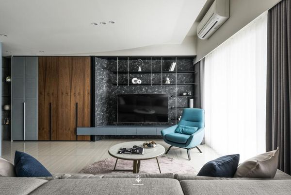 電視牆與層板結合的設計,可以有效利用牆面空間來收納各種物品,從而不佔用地面的空間,創造一個兼具美感和實用性的收納空間,讓整個客廳顯得更為整潔有序。透過這些層板,還可以輕鬆展示書籍、裝飾品等,讓客廳空間既豐富又有趣。