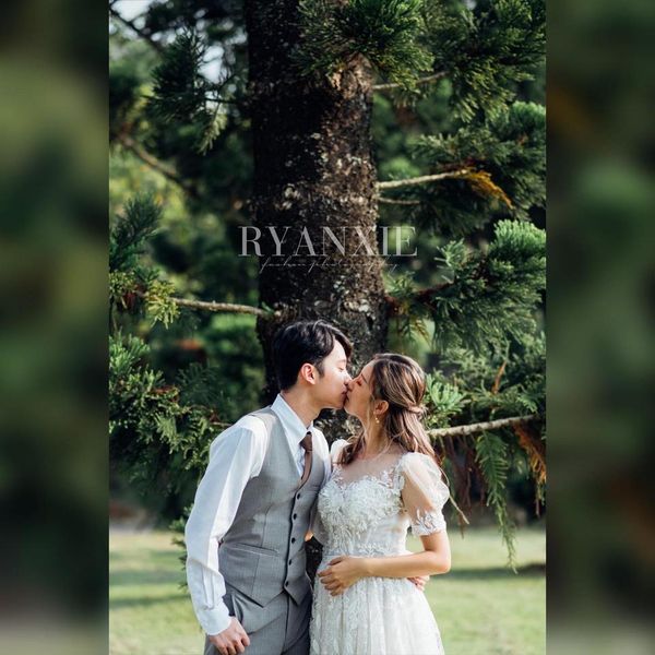 ▲照片中,新人深情相擁並親吻,背景是茂密的樹林,自然光透過樹葉灑下,營造出溫暖而感人的畫面。