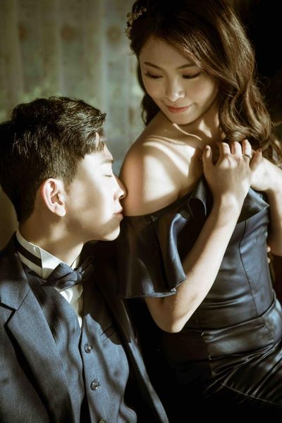 ▲照片中,新娘身穿黑色緞面禮服,搭配昏暗的光影,使得整體氛圍高貴而神秘,同時融合了韓系婚紗的簡約與高級感。
