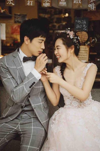 ▲照片中,新人坐在咖啡店內互動,場景充滿了日常的甜蜜感。復古風的咖啡店背景使畫面溫馨且真實。