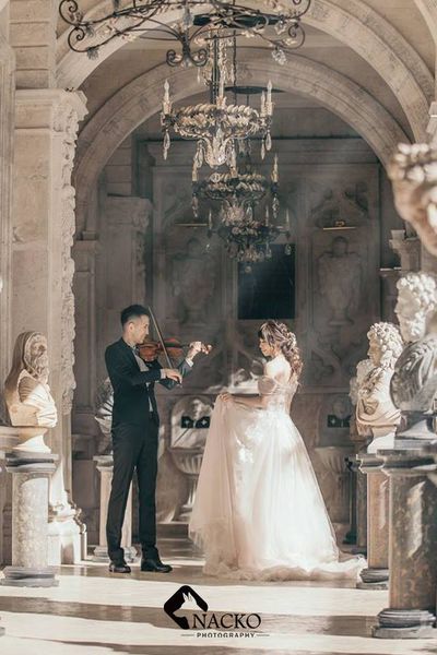 ▲照片中,新人身處古典宮殿般的場景中,背景的石雕與燭光燈飾營造出一種藝術感,完美融合韓式婚紗的高雅風格。