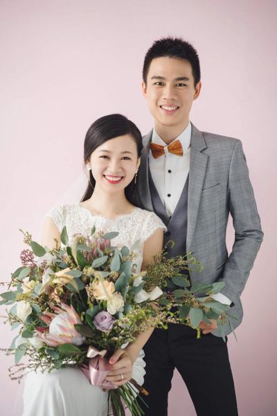 ▲上圖充分體現了韓式婚紗的簡約與高雅風格。新娘身著典雅蕾絲婚紗禮服,手捧鮮花,與新郎在淡粉色背景前展現自然的笑容,整個畫面透露出優雅的氛圍。