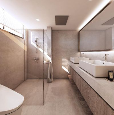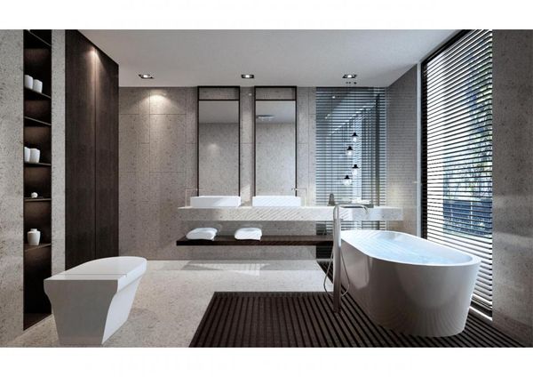 灰色調具有極佳的視覺延展性,可以讓浴室空間顯得更加寬敞明亮。透過合理搭配冷暖色調,灰色可以有效平衡空間的光線感,使其不會顯得過於單調或壓抑,並賦予整體空間現代感與美感。淺灰色牆面搭配潔白的衛浴設施,更能提升整體空間的明亮感。