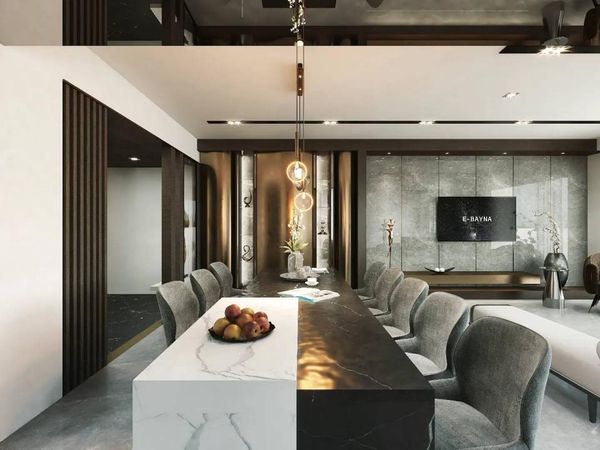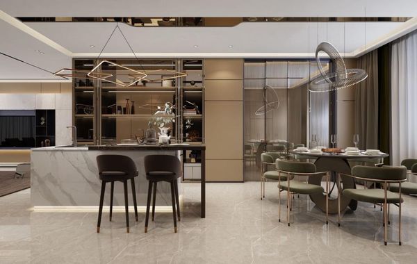 而以下的開放式餐廚空間中,金屬幾何吊燈與大理石材質的中島相互呼應,充分展現現代輕奢風的豪華感和設計張力。