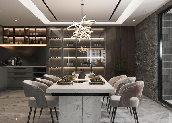 以下案例中星芒狀的吊燈與展示櫃間接燈光的結合,為空間增添細膩又不失個性的光影變化。這樣的燈光安排讓日夜空間轉換更具氣氛感,完美體現輕奢風室內設計的精緻與細節。