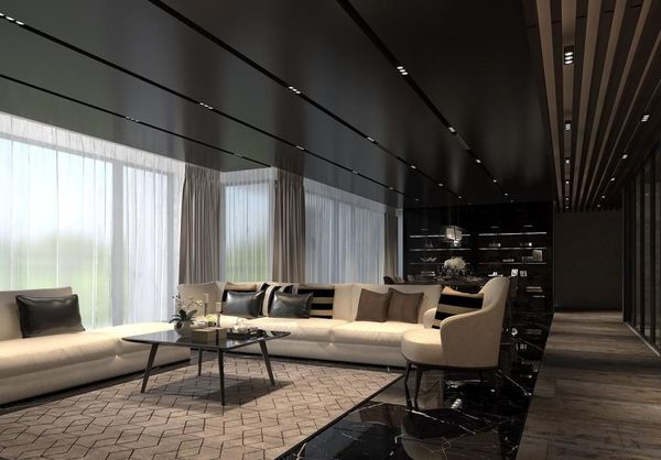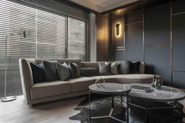 在以下案例中,整體空間以沉穩的深色天花與線性燈光設計為基底,搭配淺色沙發及大面窗景,突顯低調中的高雅氛圍,營造出時尚感十足的輕奢風現代客廳。