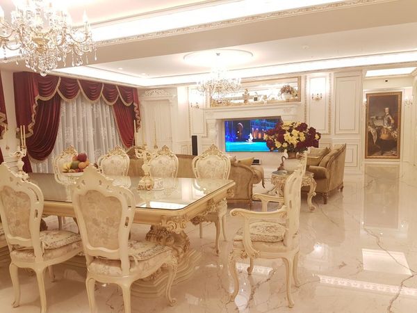 ▲大理石地板與客廳古典家具的完美結合,金色雕花餐椅與水晶吊燈增添了高貴的氣息。