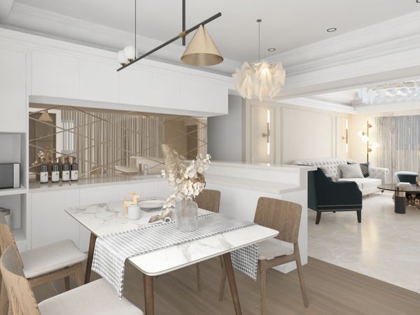 ▲大理石地板可提升整體空間的質感,讓簡約的家具和吊燈在大理石的映襯下顯得更有層次。