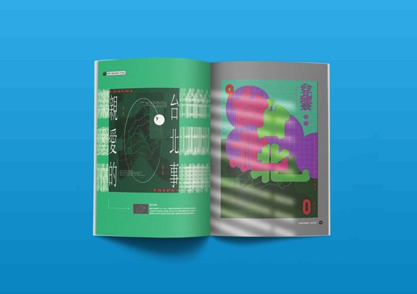 雜誌設計採用了亮綠色和對比鮮明的幾何圖案,展示了都市生活的多樣性與層次感。活潑的排版風格和強烈的色彩對比,能讓人感受到城市的活力和節奏感,適合用於生活方式類或都市探訪的雜誌。