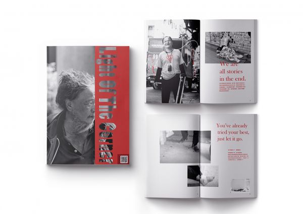 雜誌排版採用黑白攝影並輔以大面積留白,營造深刻且富有情感的氛圍。大字體的引用和簡單的文字說明,增強了整體的視覺衝擊力,適合用於紀實攝影和社會議題類雜誌,能夠讓讀者深刻體會到背後的故事。