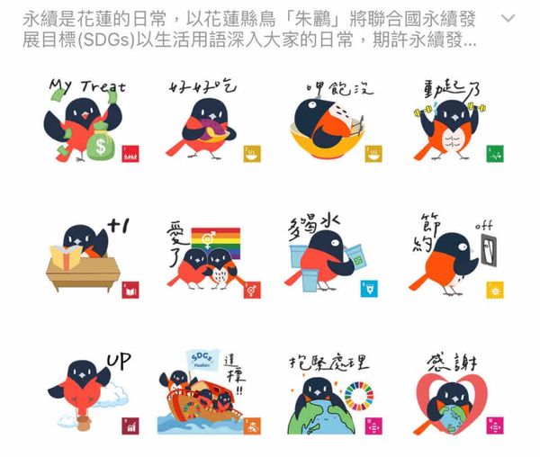 以花蓮朱鸝為主角的永續發展貼圖,配合永續發展目標(SDGs)的內容,傳遞正能量並鼓勵人們行動起來。這類貼圖能讓使用者在傳達積極訊息的同時,也參與到重要的社會議題中。