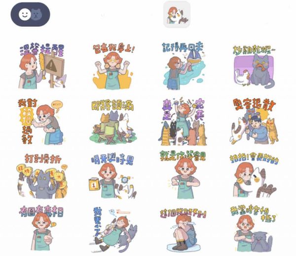 貼圖中有不同的貓咪與人類作為主體,可以從各個貼圖中的角色互動中略為知曉故事性,並增添用戶使用貼圖的互動趣味。