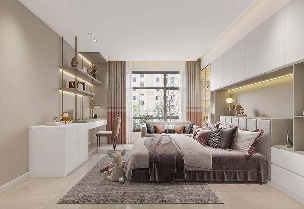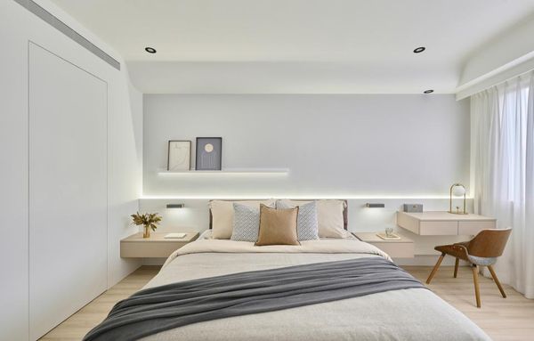 在房間中添加功能性家具時,中性色調可以有效地凸顯家具或收納空間的簡潔與實用,增加空間的實用性與美感。這樣的設計既提升了儲物空間的利用,也保持了房間佈置的簡潔。