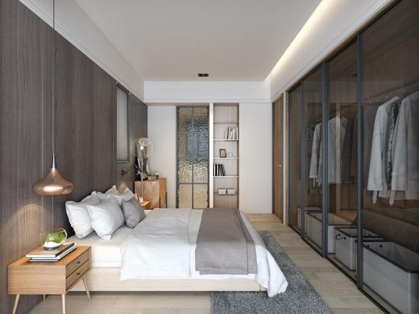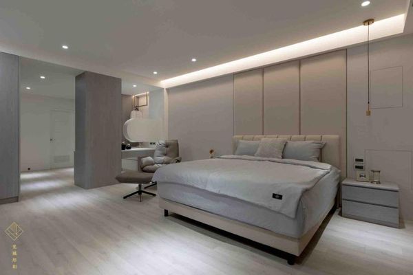 灰色調的房間設計不僅簡潔還能營造出低調而高雅的氛圍,還可以透過系統櫃與巧妙的燈光設計提升房間的儲物功能與空間質感,讓臥室更有舒適感。