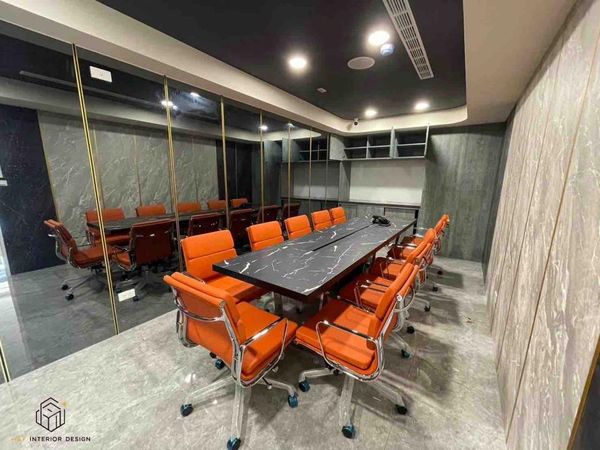 ▲橙色的座椅與黑色大理石桌面形成鮮明對比,既增添了活力,又保持專業感。這樣的設計有助於營造積極且高效的會議氛圍。