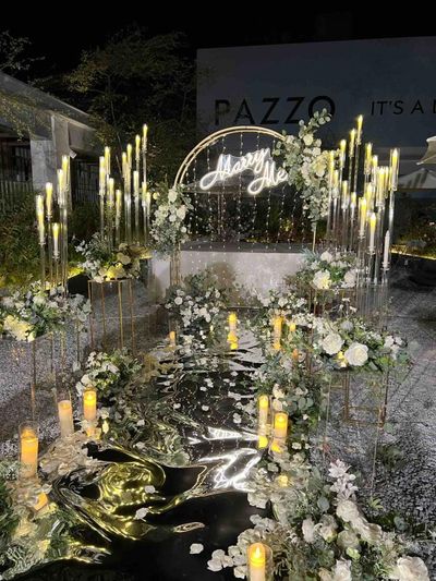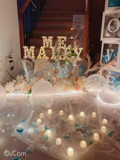 燭光和燈光是製造浪漫氛圍的秘密武器,建議加入小型燭光、星星燈飾、串燈...等求婚佈置道具來提升整體氛圍,特別是串燈的應用,能讓畫面更具層次感,無論是室內還是戶外,燭光的溫暖與星光燈的閃爍都能讓場景更加動人,燭光的微弱火焰能夠營造出一種私密而溫馨的氛圍,而燈光的運用則能夠讓整個場景更加富有層次感,增添更多浪漫,尤其是在夜景餐廳...等求婚地點,這類求婚道具的效果尤佳。