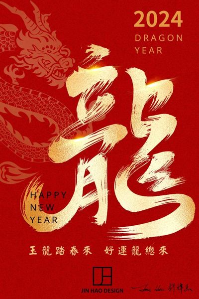賀年海報以紅色和金色為主色調,營造新春的喜慶氛圍。龍的形象和金色的字體設計,象徵著力量與幸運,非常適合在新年期間作為宣傳使用。傳統色彩與字體設計的巧妙結合,讓海報充滿節日的歡樂與吉祥。