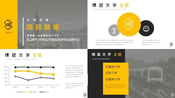 此份商務簡報範例是使用鮮明色彩以增強觀眾印象的實例,亮眼的黃色搭配簡單的黑、灰、白等色彩選擇能使觀眾對簡報內容印象深刻,下份簡報則為您展示多種顏色的搭配方式: