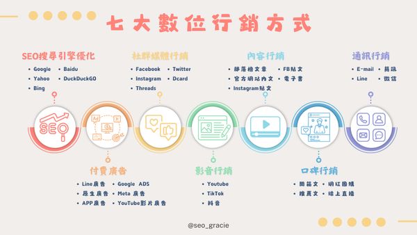 此份展示數位行銷方式的簡報,透過常見的七種顏色,區分並列的七種數位行銷方式,由於使用的顏色數量較多,故選用相同且飽和度較低的色調,避免畫面過於髒亂或刺眼。