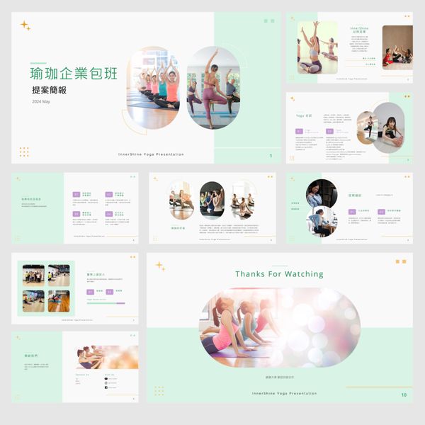 提案企業包班瑜伽課程的簡報,就善用了色彩搭配技巧與排版,避免不當的設計錯誤,以符合瑜珈放鬆、健康的想像,使用淡雅的綠色,並於版面中留有大量的留白,使畫面乾淨、整齊,並能清楚的了解簡報內容。