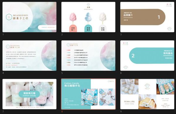 品牌簡介紹「菓子工坊」,除了選用適合糖果的繽紛色彩,也以適當的留白讓畫面更乾淨,並展示網格系統在PPT中的應用,使內容分佈有序,觀眾能夠輕鬆理解各個部分的重點。
