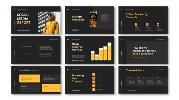 簡報展示黑底、黃色與白色三者之間主色與輔助色的和諧運用,使整個簡報顯得更加專業且易於理解。