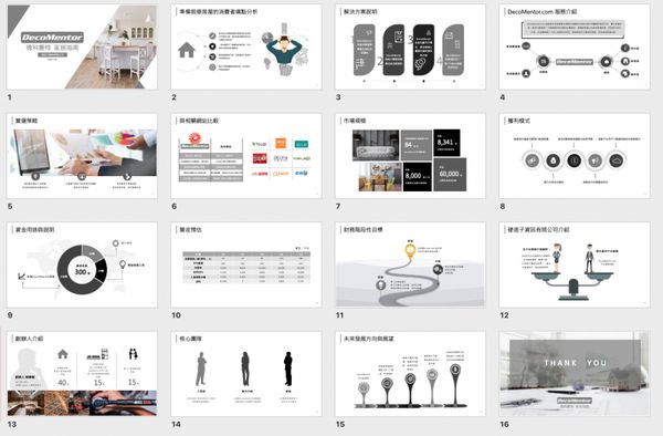 商務簡報以最基本的黑、白、灰搭配應用,不僅能使簡報簡潔易讀,還能增強觀眾的視覺效果,使簡報更有吸引力,統一的顏色選擇也讓品牌更有辨識度。