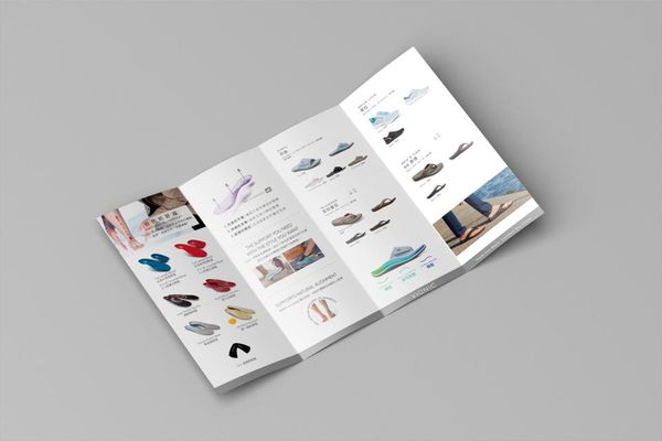鞋類產品的傳單設計採用宣傳摺頁的設計,風格注重多樣化的排版,展示不同款式的鞋子以精美的圖片和詳細的產品說明。設計中強調每款鞋子的舒適度與功能性,例如:防滑設計、支撐性等細節。摺頁的色彩搭配簡約時尚,既符合產品的定位,也讓消費者在閱讀時感到舒適,從而促進購買意願。
